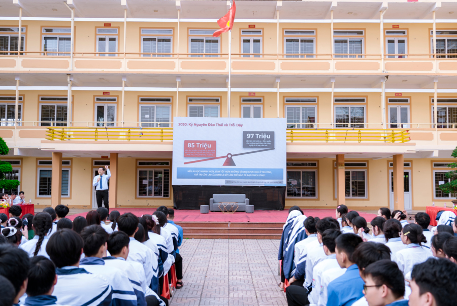 Điểm nhấn của chương trình là phần chia sẻ từ Chuyên gia – TS. Đoàn Văn Tình, Phó Trưởng khoa Quản trị Nhân lực, Học viện Hành chính và Quản trị công; đồng thời là Phó Giám đốc Trung tâm Phát triển Nhân lực Số Việt Nam. Với góc nhìn sâu sắc và cập nhật, chuyên gia đã mang đến cho các em học sinh bức tranh toàn cảnh về xu hướng phát triển trong kỷ nguyên số, đặc biệt là sự bùng nổ của trí tuệ nhân tạo (AI) và những tác động mạnh mẽ đến thị trường lao động trong tương lai.