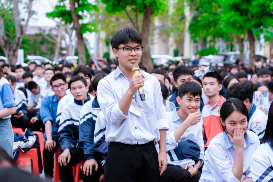 Không khí chương trình trở nên sôi nổi hơn trong phần giao lưu, hỏi đáp trực tiếp giữa học sinh và các diễn giả. Nhiều câu hỏi thiết thực xoay quanh việc lựa chọn ngành nghề, xu hướng việc làm trong tương lai, cũng như cơ hội học tập và làm việc ở nước ngoài đã được giải đáp tận tình. Đây không chỉ là cơ hội để các em tháo gỡ những băn khoăn mà còn giúp các em thêm tự tin, rõ ràng hơn trong việc định hình con đường phía trước.